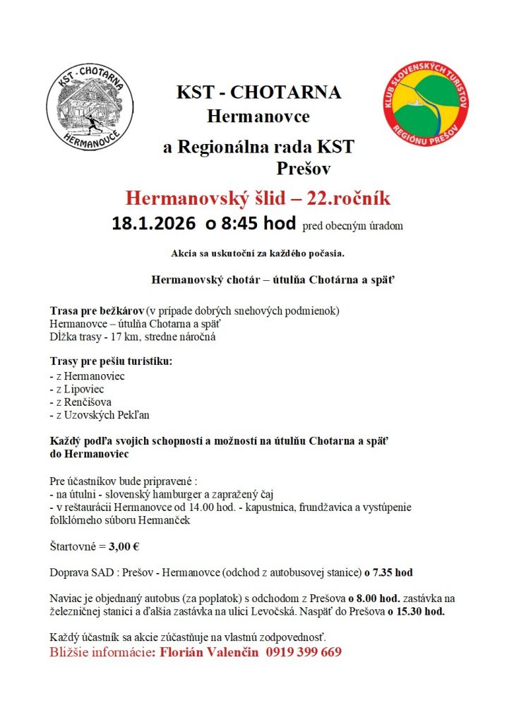 8:45 pred obecným úradom v Hermanovciach pre tých čo chcú ísť z Hermanoviec. Autobus zo Sabinova 7:50 hod., potom prestup v Jarovniciach o 8:05 hod. na BUS z Prešova do Hermanoviec.